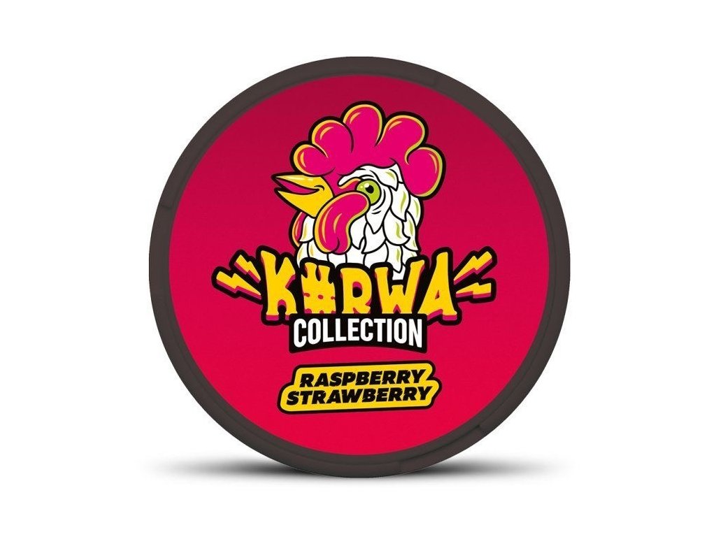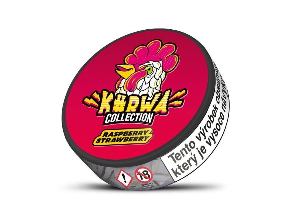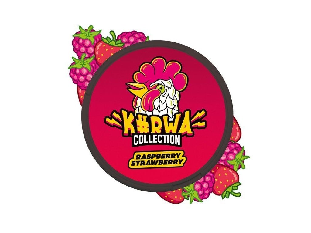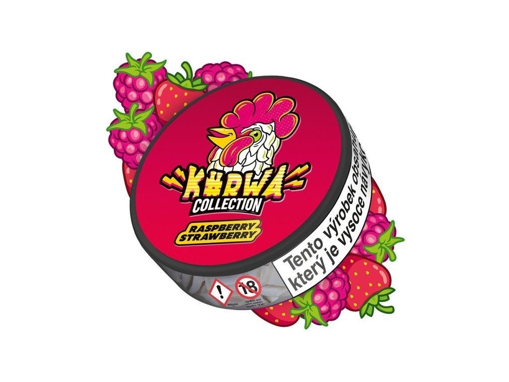 Nikotinové sáčky KURWA Collection Raspberry Strawberry – kombinace sladkých jahod a šťavnatých malin v slim formátu. 25 mg/g nikotinu (cca 16 mg/sáček), pro zkušené uživatele.