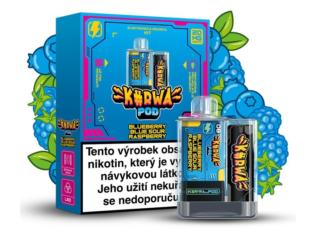 KURWA POD KIT BLUEBERRY BLUE SOUR RASPBERRY 20 MG přináší sladké borůvky a osvěžující kyselé maliny v jedné lahodné kombinaci. Až 700 potahů pro dlouhotrvající zážitek.