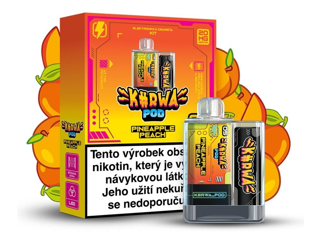 KURWA POD KIT PINEAPPLE PEACH 20 MG spojuje tropickou sladkost ananasu s jemnou sametovou chutí šťavnaté broskve. Perfektní kombinace pro osvěžující vapingový zážitek.