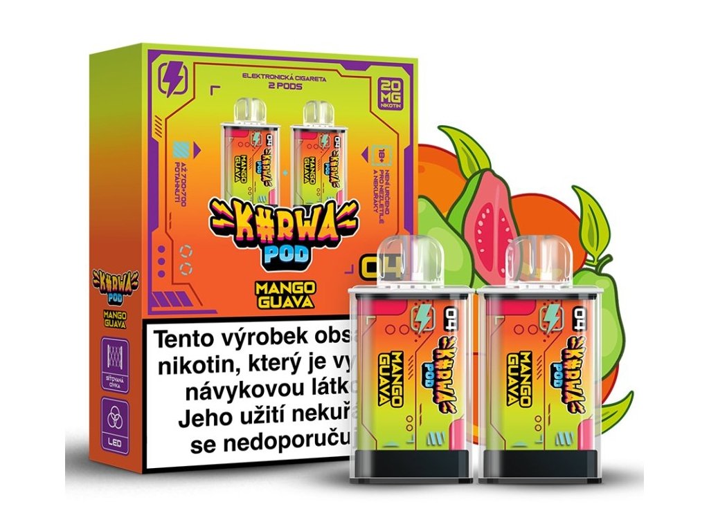 KURWA POD Mango Guava 20 mg/ml – Tropická směs sladkého manga a exotické guavy s 20 mg/ml nikotinu. Každý POD poskytuje až 700 potahů pro intenzivní a osvěžující zážitek.