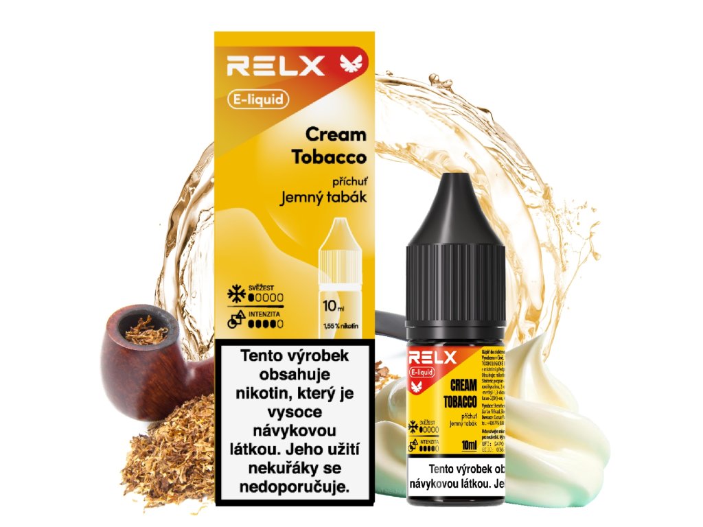 RELX liquid – Cream Tobacco – 18mg jemná tabáková chuť s krémovým podtónem vytváří vyvážený a hladký profil, který potěší milovníky klasiky každý den