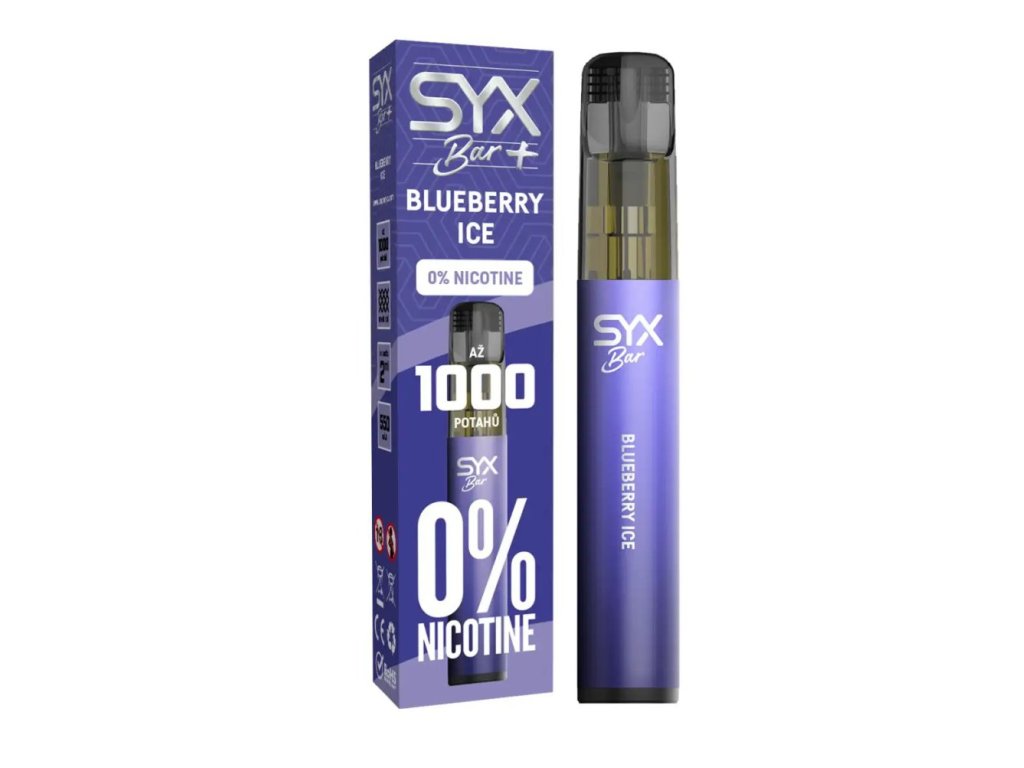 SYX BAR ZERO Blueberry Ice – chladivá borůvka bez nikotinu. 1000 potahů, 0 mg, ideální volba pro ty, kdo chtějí vapovat bez závislosti.