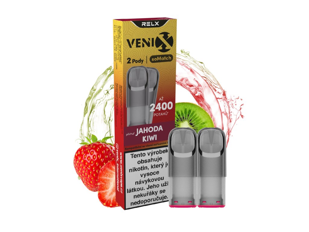 Venix RELX soMatch POD Strawberry Kiwi – Dokonalá kombinace sladkých jahod a exotického kiwi. Vyvážená ovocná chuť pro svěží a příjemný vapingový zážitek.