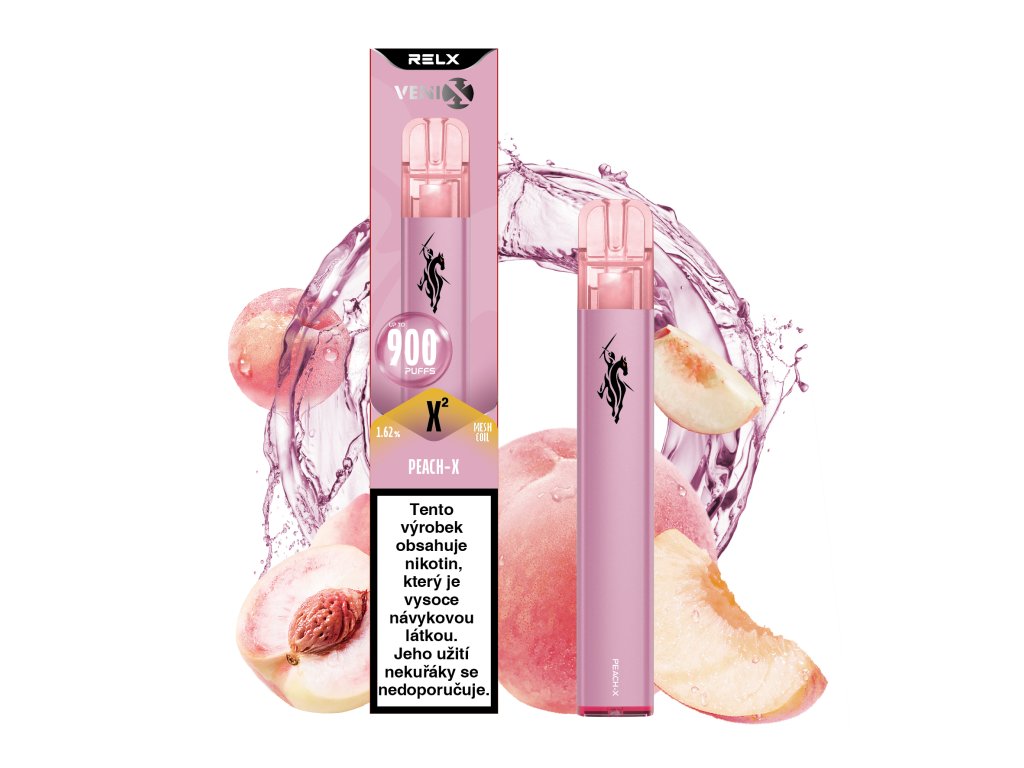 Venix X2 Peach‑X – jednorázová e‑cigareta se sladkou a šťavnatou broskvovou příchutí, až 900 potahů, 400 mAh baterie a MESH Coil 2.0 pro intenzivní chuťový zážitek