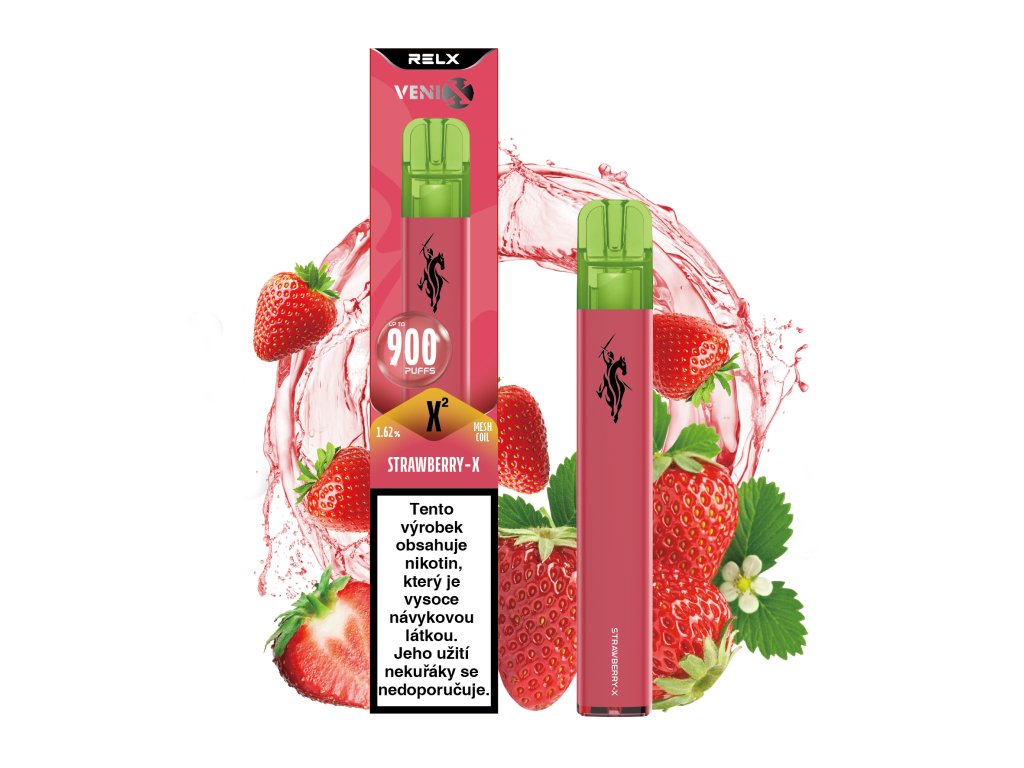 Venix X2 Strawberry‑X – jednorázová e‑cigareta s autentickou chutí sladkých a šťavnatých jahod, až 900 potahů, 400 mAh baterie a pokročilá MESH Coil 2.0 technologie